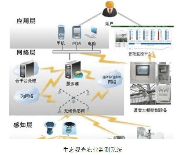 生態觀光農業監測系統主要包括:傳感終端、無線傳感網、通信終端、控制終端、監控中心和應用軟件平臺。