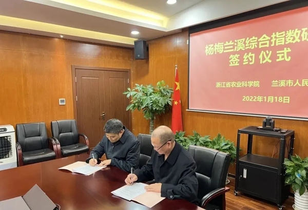 ?????? 省農科院副院長戚行江與蘭溪市人民政府副市長陳玉祥簽訂《簽訂楊梅蘭溪綜合指數研究協議》,共同加快建立蘭溪楊梅綜合指數的評價體系,推動楊梅產業數字化發展、智能化管理。