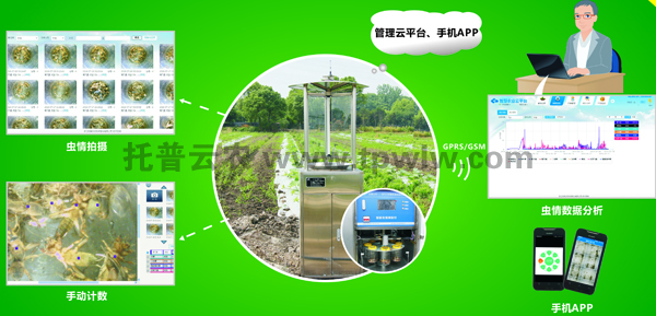 遠程拍照式蟲情測報燈利用移動無線網絡,定時采集現場圖像,自動上傳到物聯網監控平臺,平臺自動記錄采集數據,形成蟲害數據庫。可用圖表、列表形式給農業專家進行遠程診斷。工作人員可隨時遠程了解田間蟲情狀況,制定防治措施。通過手機APP,可遠程查看田間視頻信息,田間墑情、蟲情、環境氣象等數據,也可在手機上直接進行設備遠程管理或在線專家咨詢。