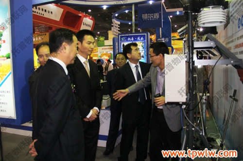 圖為:業(yè)界領(lǐng)導(dǎo)在托普展位了解固定式無線土壤墑情檢測系統(tǒng)