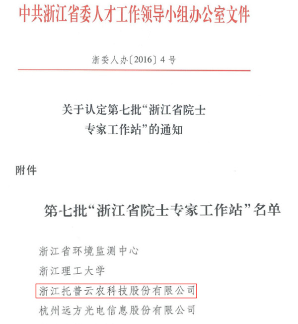 7月25日,中共浙江省委人才工作領導小組辦公室公布了第七批“浙江省院士專家工作站”名單,此次共有22家單位上榜,杭州市2家。浙江省托普云農科技股份有限公司(以下簡稱“托普云農”)成為浙江農業信息化領域內第一家獲此殊榮的企業。