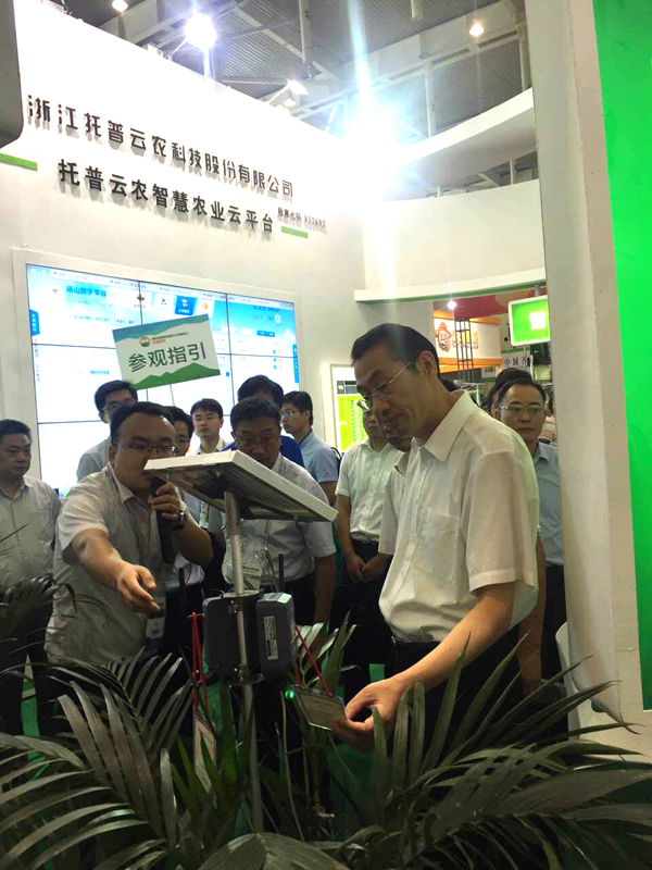 展會期間,南京市委常委、常務(wù)副市長劉以安,江蘇省農(nóng)業(yè)委員會副主任李俊超,南京市農(nóng)業(yè)委員會主任方中友,等人先后蒞臨托普展區(qū),參觀視察托普云農(nóng)農(nóng)業(yè)物聯(lián)網(wǎng)系統(tǒng)。現(xiàn)場工作人員為其進(jìn)行詳細(xì)講解。工作人員以“碭山數(shù)字果園”為例,介紹了托普云農(nóng)在碭山數(shù)字果園從農(nóng)業(yè)生產(chǎn)、管理、農(nóng)產(chǎn)品銷售到農(nóng)產(chǎn)品質(zhì)量安全追溯等環(huán)節(jié)中所應(yīng)用的系統(tǒng)設(shè)施以及系統(tǒng)應(yīng)用后果園取得的效益,以點(diǎn)帶面具象化的介紹了智慧農(nóng)業(yè)實(shí)現(xiàn)節(jié)本增效的途徑。托普農(nóng)業(yè)物聯(lián)網(wǎng)的實(shí)施應(yīng)用受到了多方肯定。