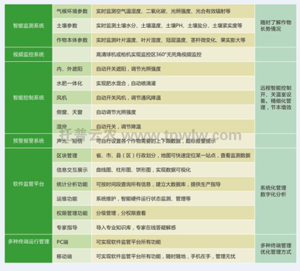智能化溫室擁有溫室環境智能監控系統,可以準確地采集溫室內大氣溫濕度、土壤溫濕度、光照強度、溶液濃度、二氧化碳濃度、風向、風速以及作物生長狀況等參數,將室內溫、光、水、肥、氣等諸多因素綜合,根據不同作物、作物不同生長階段對環境因子的不同要求,通過執行機構協調到最佳狀態,節能最高可達50%,并有節水、節肥、節藥的效果。