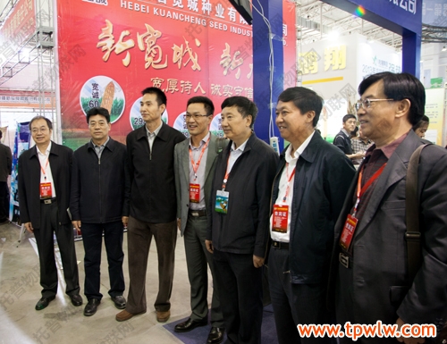 圖為:托普總經(jīng)理陳渝陽先生引領(lǐng)農(nóng)業(yè)部種子管理局張延秋局長(右二),吉林農(nóng)委李國強(qiáng)主任,全國農(nóng)技推廣服務(wù)中心黨委杭大鵬(右四)書記等領(lǐng)導(dǎo)參觀公司展臺(tái)