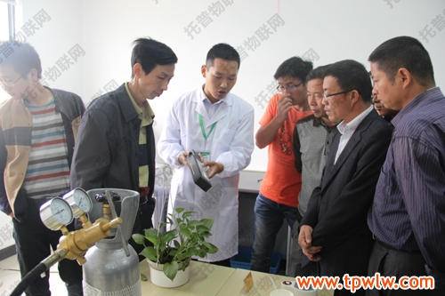 圖為:參會(huì)嘉賓在樣品室聽取托普農(nóng)業(yè)物聯(lián)網(wǎng)介紹,并表現(xiàn)出了對該系統(tǒng)的濃厚興趣