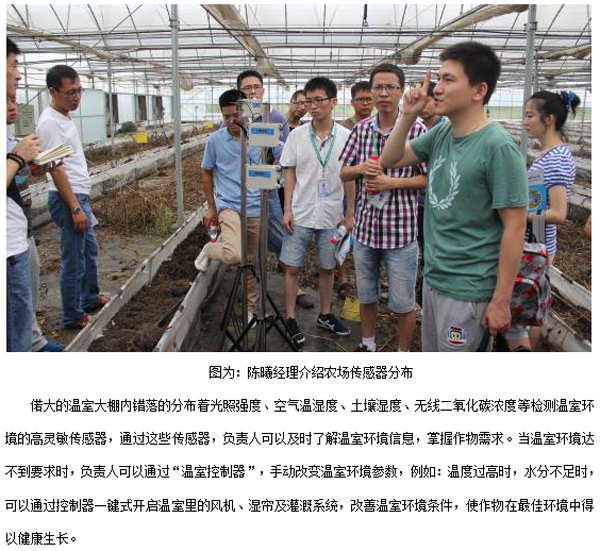 喬司農場是浙江省首家集規模種植、科研生產、網絡銷售、宅配服務為一體的國家級農業綜合開發綠色蔬菜生產基地。2014年4月中旬,托普物聯網系統在喬司農場成功搭建運行。 隨后的8月2日,銷售部全體員工在時任營銷經理陳曦的帶領下前往喬司農場,觀看農場內的物聯網系統運行情況。