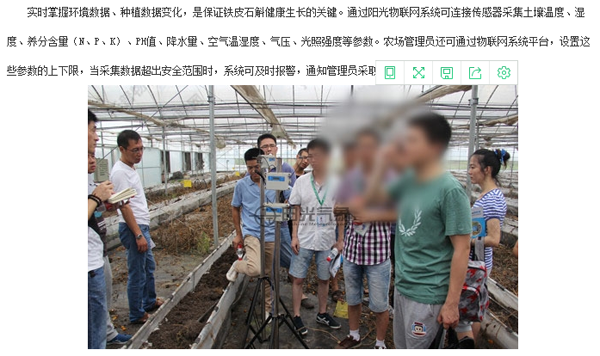 在《陽光物聯網引領仙草(鐵皮石斛)種植新方式》一文中,不僅“學習”物聯網系統的建設原理,以及操作方式外,還引用當時參觀時拍攝的圖片。為了降低圖片的辨識度,還對圖片進行模糊處理。
