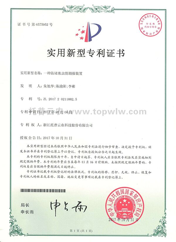 繼智能識別蟲情測報燈控制軟件獲得國家版權局軟件著作權后,托普云農在蟲情測報領域再取得新突破。10月31日,由托普云農研發的“一種防堵塞蟲情測報裝置”,獲得國家知識產權局實用新型專利授權,授權專利號:ZL 2017 2 0211882.5。