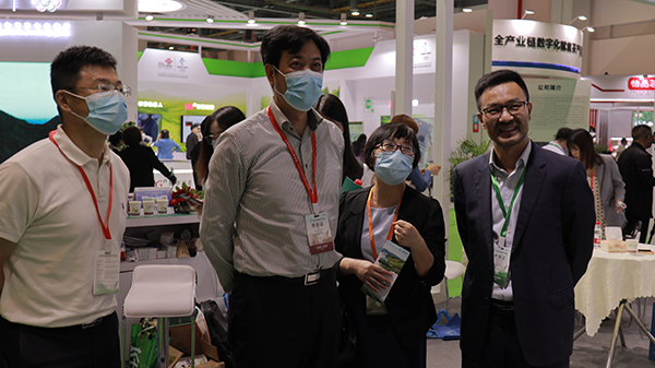 全國農業技術推廣服務中心主任魏啟文(左二)、園藝處處長周澤宇(左一)、副處長冷楊(右一)參觀托普云農展位