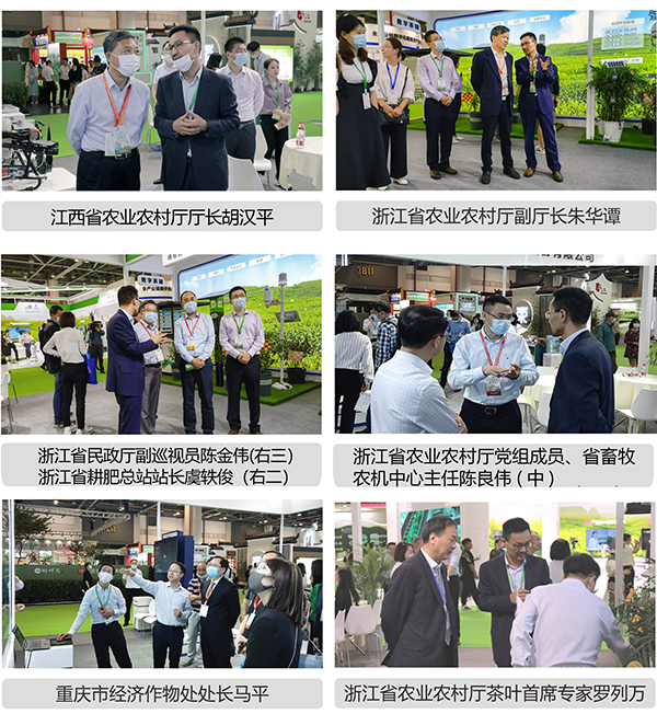 浙江省省委常委、省軍區司令員馮文平(左二);浙江省農業農村廳副廳長唐冬壽(左一);浙江省農業農村廳鄉村產業與市場信息處副處長程兵(右二)參觀托普云農展位
