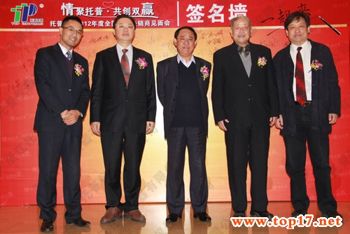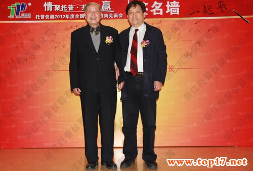 圖為:陳子元院士與高祥照處長在托普經(jīng)銷商見面會簽名墻前合影留念