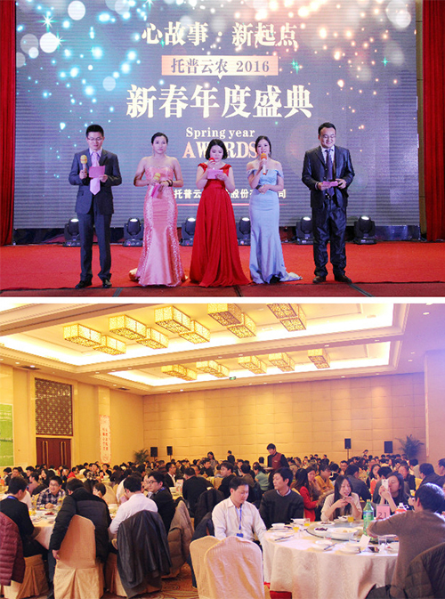 羊隨新風(fēng)辭舊歲,金猴獻(xiàn)瑞迎新春。2016年1月30日,“新起點(diǎn) 新起航——托普云農(nóng)2015年度總結(jié)表彰大會暨2016迎新春聯(lián)歡會”在杭州海外海·納川大酒店隆重舉行。300余名托普家人共聚一堂,回顧這一年所取得的成績,規(guī)劃2016年新的奮斗目標(biāo),共同迎接歡樂幸福的農(nóng)歷新年。