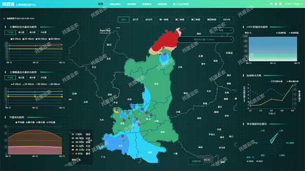 墑情監(jiān)測(cè)站點(diǎn)收集墑情資料,并在田間試驗(yàn),定期測(cè)定記錄土壤含水量,通過(guò)墑情設(shè)備,自動(dòng)采集墑情數(shù)據(jù)。所有數(shù)據(jù)和資料匯總到墑情自動(dòng)監(jiān)測(cè)系統(tǒng),系統(tǒng)負(fù)責(zé)對(duì)收集到的資料和田間試驗(yàn)結(jié)果進(jìn)行統(tǒng)計(jì)、分析和梳理,形成墑情監(jiān)測(cè)“一張圖”,體現(xiàn)監(jiān)測(cè)時(shí)效性,形成土壤墑情評(píng)價(jià)指標(biāo)體系。